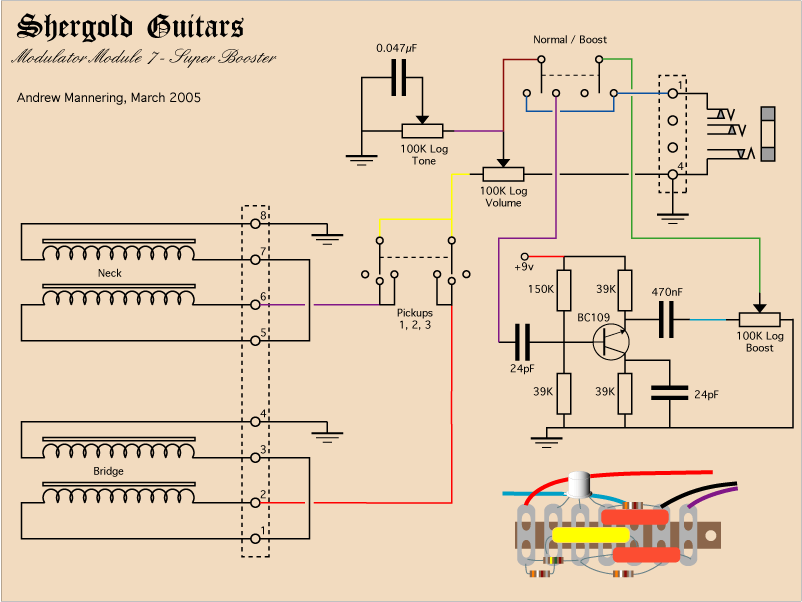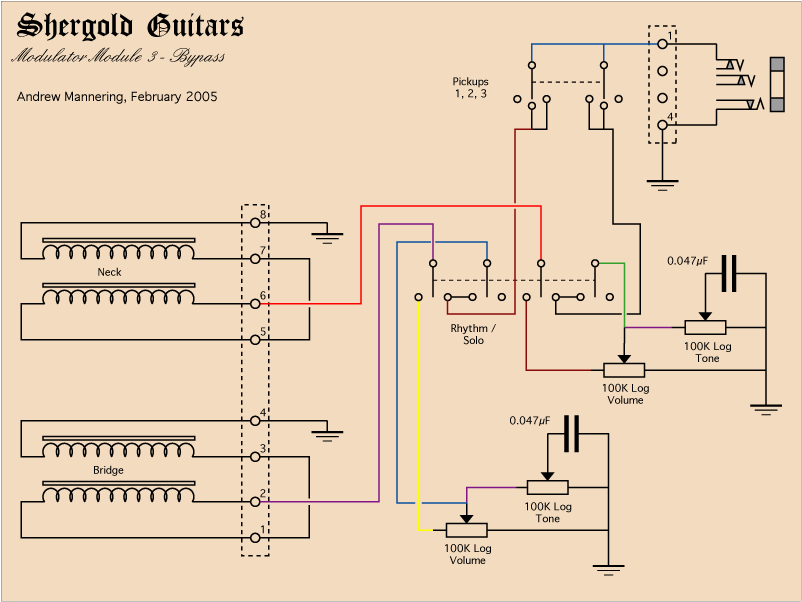 More advanced module that provides similar switching to L*s P*ul guitars, but with one feature I have never seen on any other production guitar; the option to completely bypass the tone and volume circuits. Even with the controls in the highest position there will always be some signal leakage, and hence loss of tone. With Module 3, putting the bypass switch to 'Solo' cuts the tone and volume controls from the circuits and effectively wires the pickups directly to the output jack. This is especially noticeable with the neck pickup as it gains a huge amount of 'depth' when switched in.