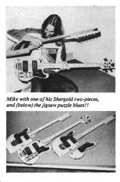 Mike Rutherford of the group Genesis used a number of more conventional Shergolds through much of the late 70's and early 80's, but is probably best known for using this huge double-neck version. This particular model was a one-off built for Mike and could be 'broken' into two parts to make two conventional guitars or clipped together in a number of combinations as a double neck.